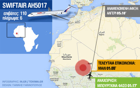 Τραγική κατάληξη είχε το θρίλερ με την πτήση AH 5017 της Air Algerie από την Μπουρκίνα Φάσο στο Αλγέρι. Έξι ώρες μετά την είδηση ότι το αεροπλάνο τύπου MD-83 χάθηκε από τα ραντάρ, τα συντρίμμια του εντοπίστηκαν στο βόρειο Μάλι. Είναι η τρίτη αεροπορική τραγωδία σε μία εβδομάδα και εάν επιβεβαιωθεί ότι και οι 116 επιβαίνοντες Swiftair είναι νεκροί, τότε μέσα σε λίγες ημέρες έχουν χάσει τη ζωή τους σε αεροπορικά δυστυχήματα 462 άνθρωποι. Αδιευκρίνισταν παραμένουν τα αίτια της συντριβής. «Δεν αποκλείει τίποτα» η Γαλλία.