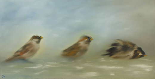 «Αυτό που με προσελκύει στα πουλιά είναι η κίνηση τους στον αέρα και η ελευθερία τους. Ενώνουν τον ουρανό με τη γη και μπορούν να πηγαίνουν από το ένα στο άλλο με χάρη και ομορφιά. Τα πουλιά είναι οι χορευτές του ουρανού, οι αγγελιοφόροι που μεταφέρουν στοιχεία από τον έναν κόσμο στον άλλο. Όταν κοιτάζουμε τα πουλιά, με τα χρώματα τους στα φτερά, διαπιστώνουμε τη σοφία της φύσης…», λέει η Όλγα Καραδήμου μιλώντας για τη δουλειά της. «Μερικά από αυτά πετούν πολύ ψηλά και πολύ μακριά. Άλλα στοιχεία που μου κινούν το ενδιαφέρον στα πουλιά είναι το αίσθημα της εύθραυστης ισορροπίας, καθώς στηρίζονται σε πολύ λεπτά πόδια. Ακόμα και το ότι τρέφονται ελάχιστα, δείχνει ότι ικανοποιούνται με τα λίγα. Διακρίνονται για την ευαισθησία τους και το ανοιχτό βλέμμα τους που μας αφήνει να δούμε μέσα στην ψυχή τους. Είναι ένα βλέμμα θλιμμένο που κλαίει γιατί, από εκεί ψηλά, έχει δει πολλά. Επίσης το γεγονός ότι τα πληγώνουμε και τα θανατώνουμε στον αέρα. Τα συναισθήματα είναι πολύ έντονα. Εκείνα δεν μπορούν να αμυνθούν, να προστατευθούν, να μιλήσουν… Κι όμως έχουν να μας πουν κάτι σημαντικό. Τα πουλιά μεταφέρουν τον πρώτο ήχο, αυτή την ίδια τη γλώσσα της αλήθειας…»