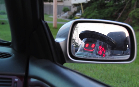 Το HitchBot χαμογελά στον καθρέπτη του συνοδηγού (Πηγή: #hitchbot)