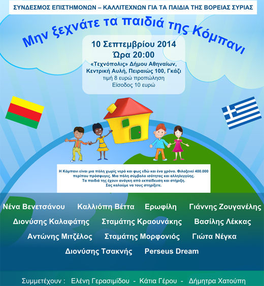 Το μη κερδοσκοπικό σωματείο «Σύνδεσμος Επιστημόνων-Καλλιτεχνών για τα Παιδιά της Βόρειας Συρίας», διοργανώνει, στις 10 Σεπτεμβρίου 2014, στις 20:00 στην Τεχνόπολη στο Γκάζι, μια μεγάλη συναυλία για τη συγκέντρωση χρημάτων, προκειμένου να λειτουργήσει και φέτος το σχολείο, στην Κόμπανι, στη Βόρεια Συρία.