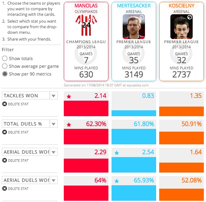 «Στην τελευταία του σεζόν στο Champions League ο Κώστας Μανωλάς κέρδισε περισσότερες μονομαχίες απ’ ότι Κοσιελνί και Μερτεζάκερ μαζί. Ο Μανωλάς με ύψος 1.86 υπερτερεί του Κοσιελνί στον αέρα. Αν και ο Μερτεζάκερ κυριαρχεί στον αέρα, τα στατιστικά δείχνουν πως ο Μανωλάς είναι σε θέση να χειριστεί το παιχνίδι με τις σέντρες στην premier league»…