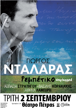 Ο Γιώργος Νταλάρας θα παρουσιάσει την Τρίτη 2 Σεπτεμβρίου στο Θέατρο Πέτρας, στην Πετρούπολη, την παράσταση Ρεμπέτικο “Unplugged”, ένα μεγάλο μουσικό ταξίδι – αφιέρωμα στο ρεμπέτικο.