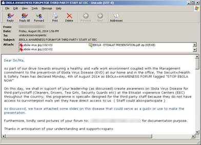 Η πρώτη εκστρατεία είναι αρκετά απλή. Οι επιτιθέμενοι στέλνουν ένα e-mail, το οποίο περιέχει μία ψεύτικη αναφορά στον ιό Έμπολα για να προσελκύσουν τα θύματα και αυτό που στην πραγματικότητα λαμβάνουν οι χρήστες είναι μόλυνση από το Trojan.Zbot malware.