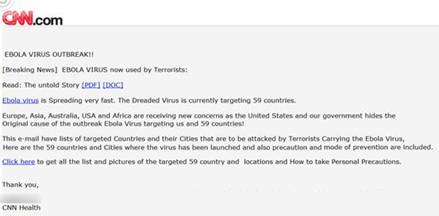 Τέλος, μία καμπάνια phishing, υποδυόμενη την ιστοσελίδα CNN δίνει σημαντικές ειδήσεις για τον ιό Έμπολα (περιέχει και ειδήσεις σχετικά με την τρομοκρατία). Παρουσιάζεται μία περίληψη και περιλαμβάνονται link για την πλήρη ιστορία. Το e-mail υπόσχεται, επίσης, μέτρα προφύλαξης καθώς και μία λίστα με τις περιοχές που έχουν μπει στο «στόχαστρο» της ασθένειας.