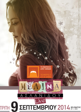 Η Μελίνα Ασλανίδου ολοκληρώνει την καλοκαιρινή της περιοδεία με μια μεγάλη συναυλία που θα κάνει στην Τεχνόπολη στο Γκάζι, την Τρίτη 9 Σεπτεμβρίου 2014. Ώρα Έναρξης: 21.30.