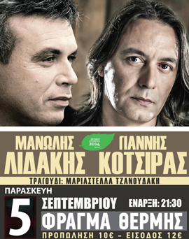Δύο από τους σπουδαιότερους σύγχρονους ερμηνευτές της ελληνικής μουσικής ο Γιάννης Κότσιρας και ο Μανώλης Λιδάκης, για πρώτη φορά μαζί επί σκηνής στο Φράγμα της Θέρμης στη Θεσσαλονίκη, την Παρασκευή 5 Σεπτεμβρίου 2014. Ο Μανώλης Λιδάκης με επιλογές τραγουδιών από τον νέο του δίσκο «Αύριο θα είναι αργά» και με άξονα τις πιο αντιπροσωπευτικές στιγμές […]