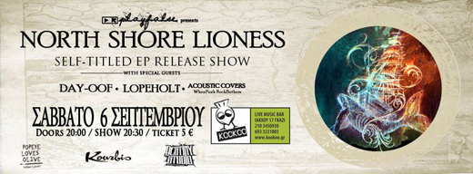 Οι North Shore Lioness είναι μία πενταμελής μπάντα. Σχηματίστηκε το 2012 και μετά από πολλαπλές αλλαγές στο line-up της, ξεκίνησε τις ζωντανές εμφανίσεις την άνοιξη του 2014, κερδίζοντας με μικρά βήματα ένα κοινό με τον επηρεασμένο από διάφορα είδη, Post-Hardcore ήχο τους. Αλλεπάλληλα riffs, δυναμικά beats, εναλλασσόμενα screams με αρμονικές διφωνίες θα δημιουργήσουν μία δίνη ευχάριστου κλίματος, αλλά και ένα γεμάτο συγκίνηση, αποχαιρετιστήριο set για τον κιθαρίστα τους Παύλο, ο οποίος στα τέλη του μήνα φεύγει μόνιμα για τον Καναδά.