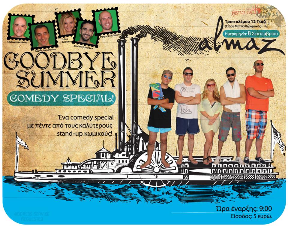Η τελευταία μεγάλη stand up comedy παράσταση του καλοκαιριού, το «Goodbye Summer Comedy», ανεβαίνει στο Almaz τη Δευτέρα 8 Σεπτεμβρίου στις 21:00.