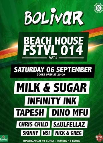 Οι πιστοί οπαδοί της dance σκηνής, δίνουν για ακόμη μια φορά ραντεβού πάνω στην άμμο από νωρίς το απόγευμα του Σαββάτου 6 Σεπτεμβρίου έως τις πρώτες πρωινές ώρες της επόμενης ημέρας, στο δεύτερο μέρος του Beach House Festival της σεζόν στο Βοlivar Beach Bar.