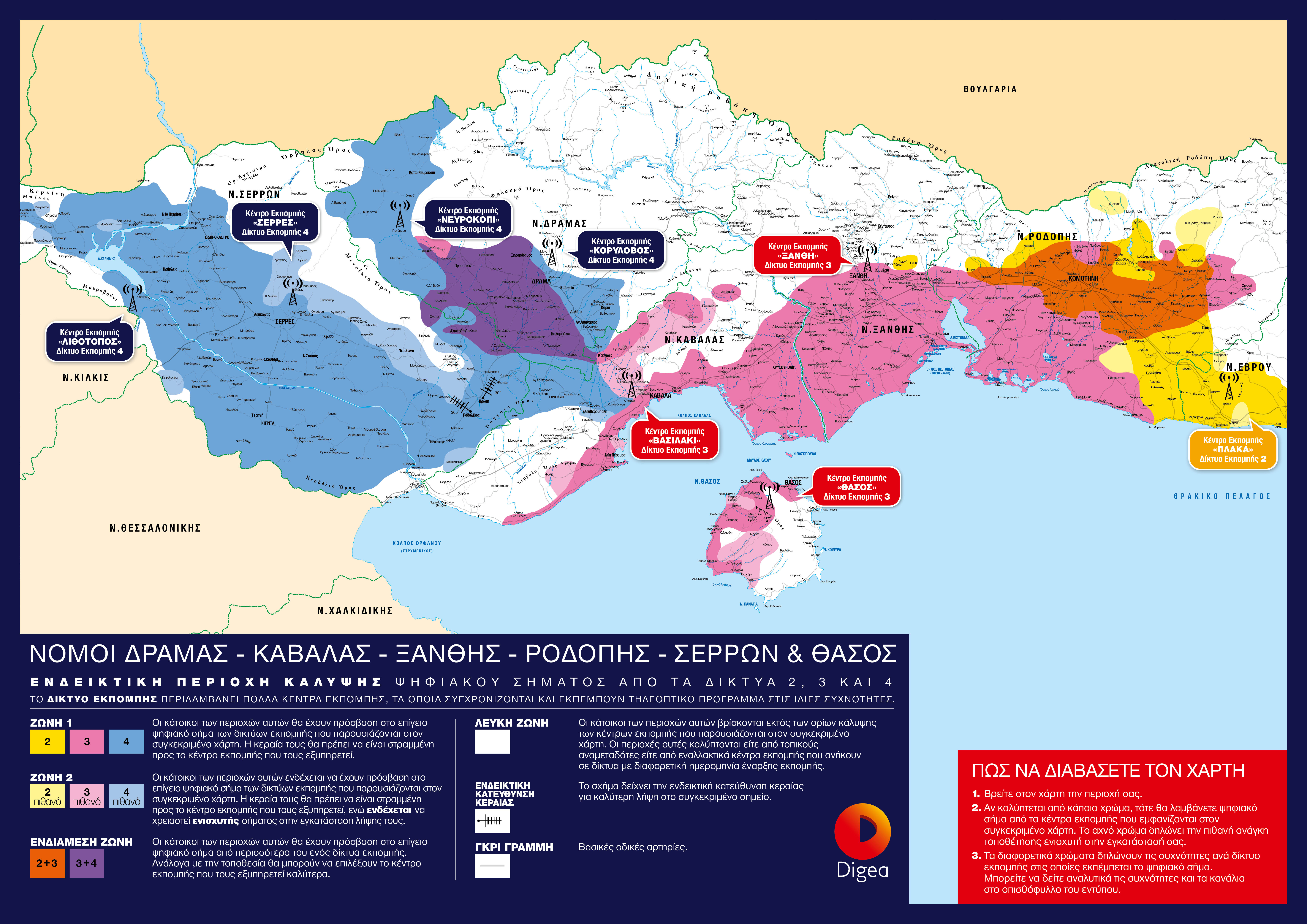 Πρόσβαση στο επίγειο ψηφιακό σήμα της Digea αποκτούν από τις 5 Σεπτεμβρίου περισσότεροι από 850.000 τηλεθεατές στη Βορειοανατολική Ελλάδα και τα νησιά του Βορειοανατολικού Αιγαίου. Στις 02.00 τα ξημερώματα θα διακοπεί η αναλογική εκπομπή των τηλεοπτικών σταθμών και θα υπάρχει μόνο η ψηφιακή εκπομπή.
