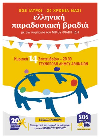 Οι SOS Ιατροί γιορτάζουν τα 20 χρόνια προσφοράς τους (24 ώρες το 24ωρο) στο κοινωνικό σύνολο και σε συνεργασία με την Κιβωτό του Κόσμου στήνουν ένα κεφάτο ελληνικό γλέντι στην Τεχνόπολις του Δήμου Αθηναίων, την Κυριακή 14 Σεπτεμβρίου.