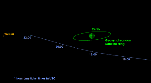 Ο αστεροειδής πέρασε κάτω από το επίπεδο στο οποίο κινούνται οι γεωστατικοί δορυφόροι. Οι χρόνοι δίνονται σε ώρα Γκρίνουιτς. (Εικόνα: NASA/JPL-Caltech )