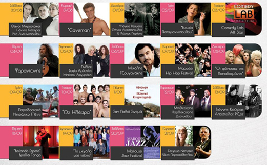 Το πολυσυλλεκτικό φεστιβάλ περιλαμβάνει, μεταξύ άλλων, αφιέρωμα στον ελληνικό κινηματογράφο με την Άννα Φόνσου (11/9 ), τη σύμπραξη των Bαρθακούρη, Μπιθικώτση και Διονυσίου (12/9 ), παράσταση tango με τη σοπράνο Βιβιάννα Γιαννάκη (18/9 ), ένα μικρό jazz festival (20/9 ) και τη συναυλία της Γεωργίας Νταγάκη με καλεσμένο τον Νίκο Πορτοκάλογλου (21/9 ). Περισσότερα…