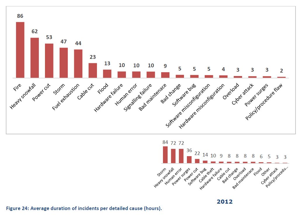 Αν και δεν βρήκαμε στην έκθεση αναλυτικά στοιχεία ανά είδος υπηρεσίας, ο ENISA διακρίνει πως οι πλέον πολύωρες διακοπές παροχής υπηρεσιών οφείλονταν σε φυσικά φαινόμενα, δεν ήταν όμως λίγες αθροιστικά οι διακοπές 2 έως και 10 ωρών που οφείλονται σε λάθη που θεωρητικά τουλάχιστον θα μπορούσαν να αποφευχθούν. Πάντως, σε σχέση με τα περιστατικά του 2012 η διάρκεια της διακοπής εξαιτίας «ανθρώπινου λάθους» μειώθηκε από τις 72 στις 10 ώρες.