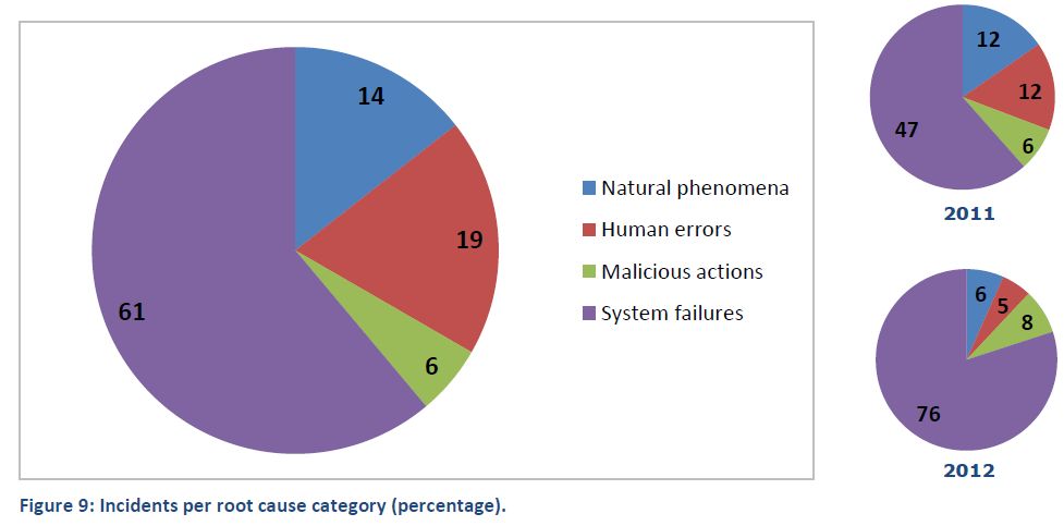 Από την έκθεση του Οργανισμού ENISA προκύπτει πως το 2013 την μεγαλύτερη ευθύνη για τα συμβάντα φέρουν το λογισμικό και το υλικό (software bug, hardware failure), αν και απαιτείται μια πιο προσεκτική εξέταση σε ότι αφορά τουλάχιστον την αιτία «hardware failure», η οποία μπορεί να προκλήθηκε από φυσικά αίτια, π.χ. μια καταιγίδα που οδήγησε σε απώλεια ηλεκτρικού ρεύματος και στην συνέχεια βλάβη στο υλικό.