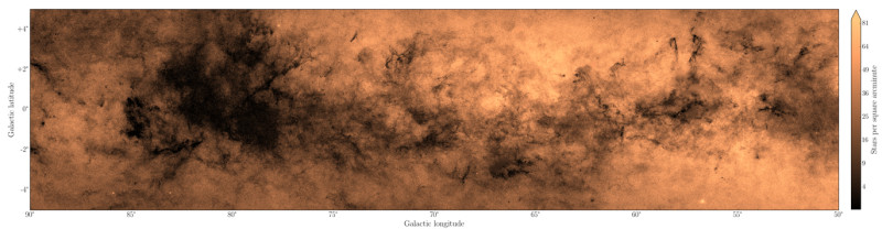 Ο χάρτης πυκνότητας σε ένα μικρό τμήμα του Γαλαξία. Οι σκοτεινές περιοχές αντιστοιχούν σε σύννεφα γαλαξιακής σκόνης. Όσο πιο φωτεινή μια περιοχή, τόσο μεγαλύτερη η πυκνότητα των άστρων (Πηγή: Hywel Farnhill, University of Hertfordshire)