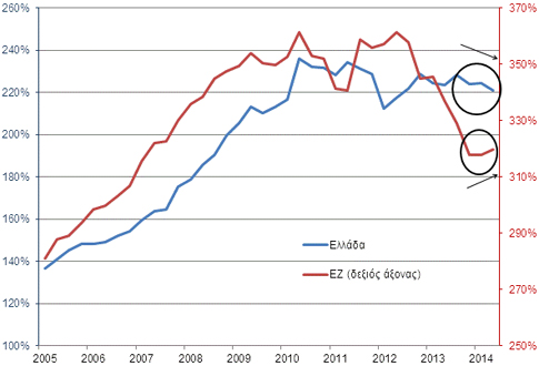 Από το διάγραμμα μπορούμε να συμπεράνουμε πως ο κύκλος απομόχλευσης για την ευρωζώνη (μεσοσταθμικά) φαίνεται να κλείνει. Δεν φαίνεται να ισχύει το ίδιο για την Ελλάδα. Συνεπώς, για την ελληνική οικονομία αναμένουμε παράταση της φάσης σταθεροποίησης, καθώς η έλλειψη χρηματοδότησης από το τραπεζικό σύστημα ασκεί υφεσιακές επιδράσεις. Αναμένουμε τα αποτελέσματα του T-LTRO στην ελληνική οικονομία μετά την πρώτη φάση ενεργοποίησης των 5,5 δισ. ευρω.