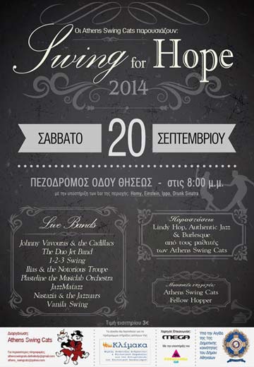 Πιστοί στο ραντεβού τους για 4η χρονιά, οι Athens Swing Cats προσκαλούν το αθηναϊκό κοινό στο 4ο ετήσιο φιλανθρωπικό φεστιβάλ -σύμπραξη όλων των μεγάλων παραγόντων του swing- «Swing for Hope 2014».