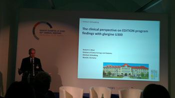 Ο Δρ Ρίτζελ, μέλος της ερευνητικής ομάδας του πολυκεντρικού προγράμματος EDITION, κατά τη διάρκεια των εργασιών του 50ου EASD παρουσίασε τα καταληκτικά συμπεράσματα που αφορούσαν την ινσουλίνη glargine U300, όπως αυτά αποτυπώθηκαν στην ανάλυση των μελετών EDITION I, II και ΙΙΙ.