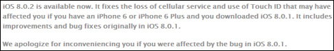 Από την επίσημη ανακοίνωση της Apple για την έκδοση του iOS 8.0.2