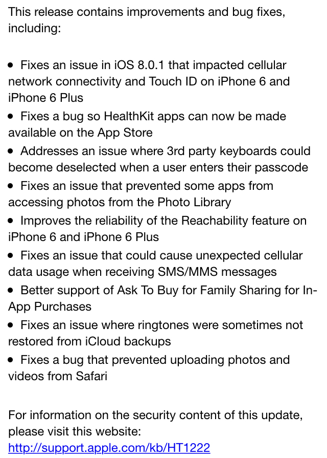 Δύο ημέρες μετά την έκδοση της ελαττωματικής ενημέρωσης για το iOS, η Apple διέθεσε την ενημέρωση iOS 8.0.2 με αποκλειστικό σκοπό να επιλύσει τα προβλήματα σύνδεσης των iPhone 6 και iPhone 6 Plus με τα δίκτυα κινητής τηλεφωνίας που το προηγούμενο update.