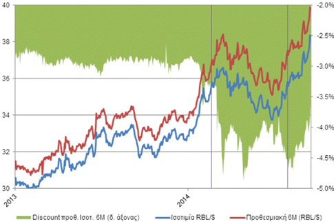 Από την αρχή της Ουκρανικής κρίσης, της οποίας η «έξοδος» του Yanukovych από το προεδρικό αξίωμα της χώρας (Φεβρουάριος 2014) αποτέλεσε μόνο την αρχή, το ρωσικό ρούβλι ακολουθεί έντονα πτωτική πορεία. Ύστερα από σύντομο διάλειμμα (παρέμβαση της κεντρικής τράπεζας της Ρωσίας;) η υποχώρηση του ρωσικού νομίσματος συνεχίστηκε εντονότερη μετά την ανακοίνωση νέου γύρου εμπορικών κυρώσεων κατά της χώρας από ΗΠΑ και Ευρωπαϊκή Ένωση (Ιούλιος 2014). Ως αποτέλεσμα το ρούβλι υποχωρεί από τις αρχές του έτους κατά 16% έναντι του δολαρίου και κατά 12% έναντι ενός ευρύτερου καλαθιού νομισμάτων (σταθμισμένο με βάση τις εμπορικές σχέσεις της Ρωσίας). Με βάση τις σημερινές τιμές της προθεσμιακής αγοράς (π.χ. στο διάγραμμα απεικονίζεται και η εξάμηνη προθεσμιακή ισοτιμία και η αντίστοιχη έκπτωση –discount- έναντι της τρέχουσας ισοτιμίας), η υποχώρηση του ρωσικού νομίσματος δεν αναμένεται να ανακοπεί τους επόμενους μήνες.