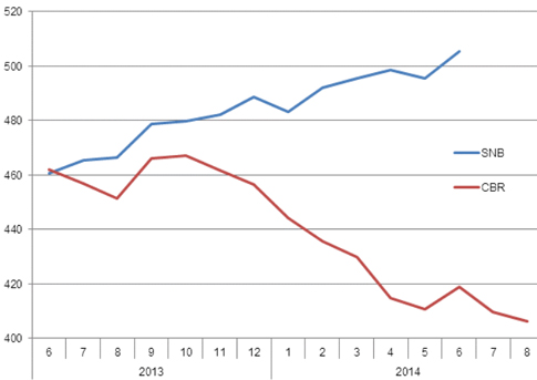 Η υποχώρηση αυτή, οφείλεται σε μεγάλο βαθμό στην φυγή κεφαλαίων που παρατηρείται από τη Ρωσία και που σε μεγάλο βαθμό φαίνεται να κατευθύνεται προς την ασφάλεια του Ελβετικού τραπεζικού συστήματος. Η εξέλιξη αυτή καταγράφεται στη μεταβολή στα συναλλαγματικά διαθέσιμα των κεντρικών τραπεζών των δύο χωρών κατά τους τελευταίους μήνες (Διάγραμμα 2).