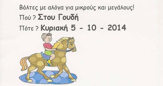 Έχετε όρεξη για βόλτα και συγχρόνως για κάτι διαφορετικό, αλλά χωρίς να απομακρυνθείτε ιδιαίτερα από το κέντρο της πρωτεύουσας; Τότε μια ενδιαφέρουσα επιλογή θα ήταν μια όμορφη βόλτα πάνω… σε άλογο! Την ευκαιρία σας τη δίνει την Κυριακή 5 Οκτωβρίου 2014 ο Σύνδεσμος Θεραπευτικής Ιππασίας Ελλάδος στο Γουδή. Μικροί και μεγάλοι θα έχουν τη δυνατότητα να κάνουν τις βόλτες τους με τα άλογα από τις 10 το πρωί έως τις 2 το μεσημέρι διασκεδάζοντας και γνωρίζοντας τα όμορφα αυτά τετράποδα. Π. Κανελλοπούλου 10, Γουδή, τηλ.: 210 7488566