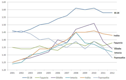 Ο Συνολικός Δείκτης Γονιμότητας (Total Fertility Rates) αποτυπώνει την αναλογία αριθμού παιδιών ανά γυναίκα (Διάγραμμα 1). Η πτώση είναι ιδιαίτερα αισθητή για την Ελλάδα, την Πορτογαλία και την Ισπανία. Για παράδειγμα στην Ελλάδα το 2012 αντιστοιχούσαν 1,34 παιδιά ανά γυναίκα έναντι 1,51 παιδιά ανά γυναίκα το 2010.