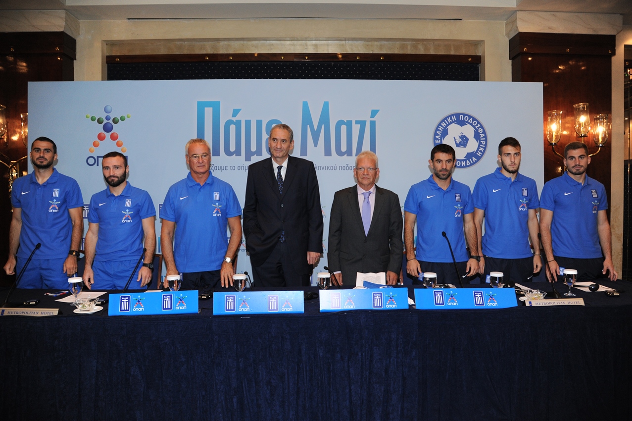 Τη νέα χορηγία της Εθνικής Ομάδας Ποδοσφαίρου για τα επόμενα τέσσερα χρόνια παρουσίασε η ΟΠΑΠ Α.Ε. ως Μέγας Χορηγός, με την Ελληνική Ποδοσφαιρική Ομοσπονδία, την Τετάρτη 8 Οκτωβρίου 2014. Ομιλητές στην εκδήλωση ήταν ο Πρόεδρος και Διευθύνων Σύμβουλος της ΟΠΑΠ Α.Ε., κ. Kamil Ziegler, ο Πρόεδρος της ΕΠΟ, κ. Γιώργος Σαρρής, ο Ομοσπονδιακός Τεχνικός, κ. Claudio Ranieri, ο Διευθυντής Ποδοσφαίρου της Εθνικής κ. Γιώργος Καραγκούνης, ο πρώτος αρχηγός της Εθνικής, κ. Δημήτρης Σαλπιγγίδης, ο αρχηγός της ομάδας κ. Γιώργος Σαμαράς και οι παίκτες κ. Κώστας Φουρτούνης και κ. Χάρης Μαυρίας.