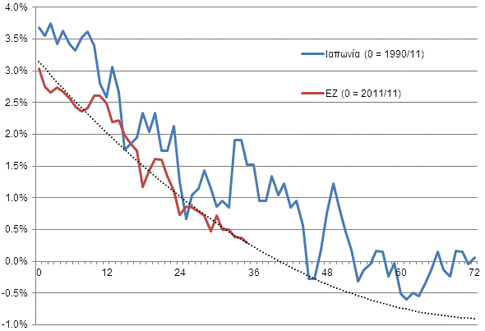Διάγραμμα 1: Ετήσιος ρυθμός μεταβολής του επιπέδου τιμών από το υψηλότερο επίπεδο πριν την κρίση στην Ιαπωνία (Νοέμβριος 1990) και την ζώνη του ευρώ (Νοέμβριος 2011).