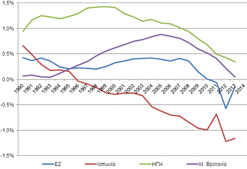 Με τα επίπεδα πληθωρισμού στη ζώνη του ευρώ να συνεχίζουν την φθίνουσα πορεία των τελευταίων ετών (χαμηλότερα του +0,3% τον Σεπτέμβριο σε σχέση με τον αντίστοιχο περυσινό μήνα), δεν μπορεί κανείς παρά να προχωρήσει σε σύγκριση με την πορεία της Ιαπωνικής οικονομίας των τελευταίων δύο (και πλέον) δεκαετιών προς τον αποπληθωρισμό. Παρά τις διαβεβαιώσεις του M. Draghi πως η σημερινή κατάσταση στην Ζώνη του Ευρώ δεν συγκρίνεται με το «ξεφούσκωμα» της αγοράς ακινήτων των αρχών της δεκαετίες του 1990 που οδήγησε την Ιαπωνική οικονομία σε στασιμότητα και αποπληθωρισμό, στο Διάγραμμα 1 αποτυπώνεται μία ανησυχητικά παρόμοια εξέλιξη του επιπέδου τιμών.