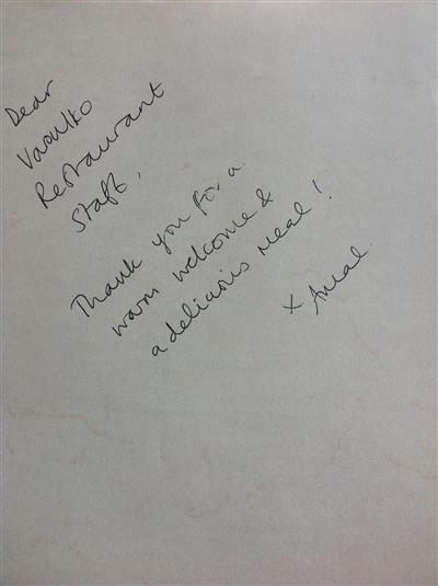 Το μενού του σεφ Λευτέρη Λαζάρου ήταν αυτό που άρμοζε σε μια διασημότητα. Η ίδια συνοδευόμενη από την υπουργό Τουρισμού, Ολγα Κεφαλογιάννη, μπήκε στο εστιατόριο γύρω στις 2.30 μ.μ. μετά τη συνάντηση που είχε με τον υπουργό Πολιτισμού, Κωνσταντίνο Τασούλα.