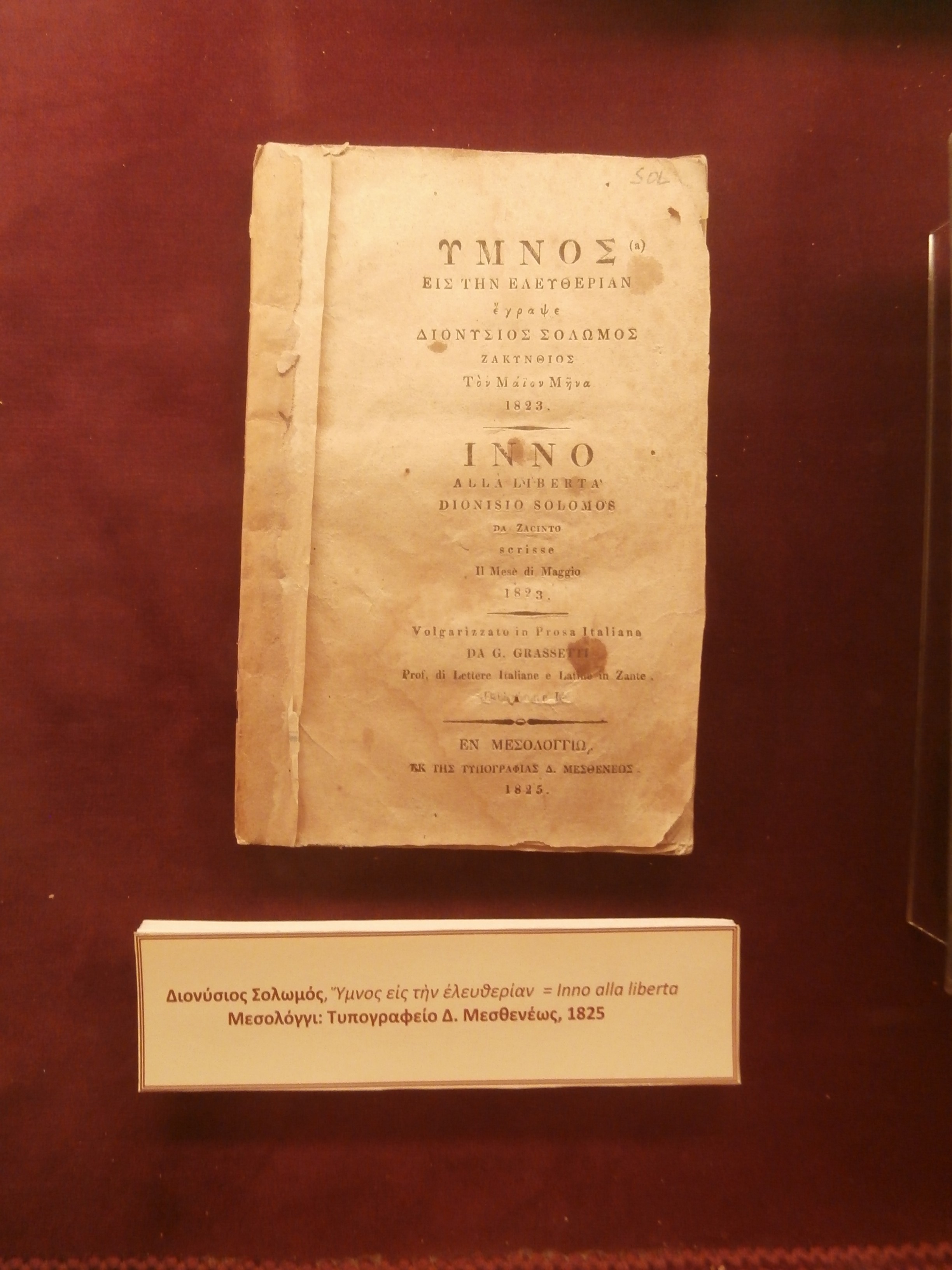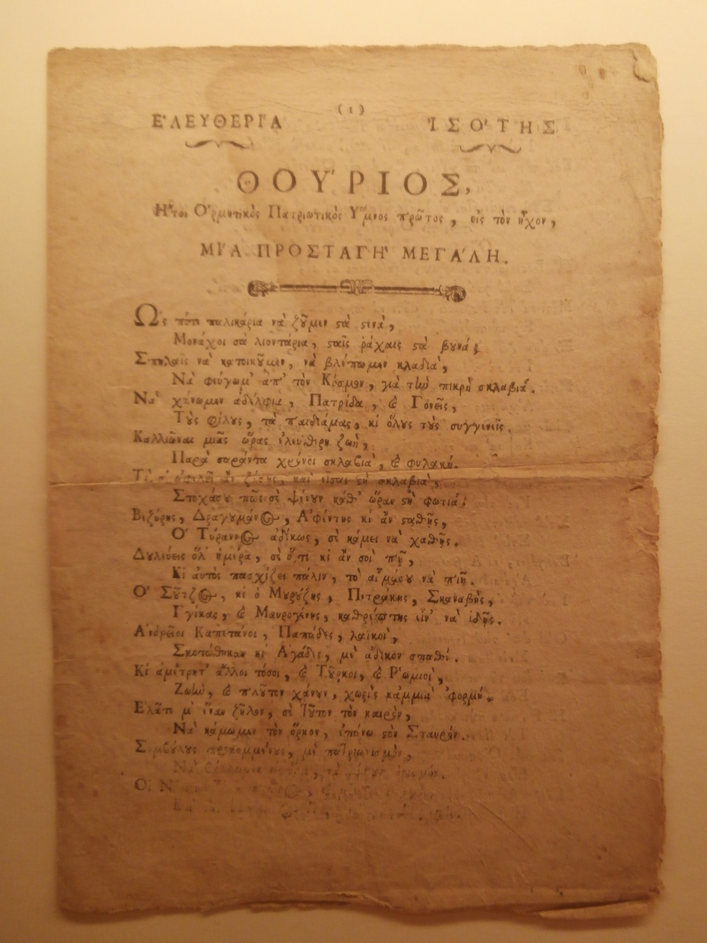 Δύο από τα σπουδαιότερα ντοκουμέντα της έκθεσης είναι ο «Θούριος» του Ρήγα, ένα έντυπο μονόφυλλο του 1798, καθώς και η πρώτη έκδοση του «Ύμνου εις την Ελευθερία» του Διονύσιου Σολωμού το 1825 από τον Claude Fauriel στο Παρίσι και το τυπογραφείο Firmin Didot. Επίσης, παρουσιάζεται η χειρόγραφη προκήρυξη της Ελληνικής Επανάστασης από τον Αλέξανδρο Υψηλάντη, που φέρει την χρονολογία 23 Φεβρουαρίου 1821.