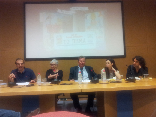 Φωτογραφία από την παρουσίαση της νέας σειράς του Βήματος, που πραγματοποιήθηκε την Πέμπτη 16 Οκτωβρίου 2014 στο αμφιθέατρο του Δημοσιογραφικού Οργανισμού Λαμπράκη. Από αριστερά: Νίκος Μπακουνάκης (δημοσιογράφος), Ξένια Καλογεροπούλου (ηθοποιός, Πρόεδρος του θεάτρου «Πόρτα»), Αντώνης Καρακούσης (διευθυντής εφημερίδας «ΤΟ ΒΗΜΑ»), Ευγενία Δημητροπούλου (ηθοποιός), Κώστας Γάκης (ηθοποιός). Τον παληό καιρό