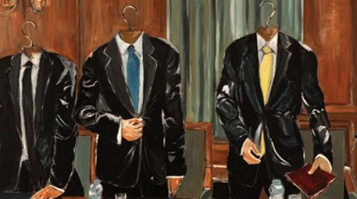 Στα έργα της απεικονίζονται Καλοντυμένες φιγούρες δίχως πρόσωπα σε γνώριμους δημόσιους χώρους. Σκηνές μιας εικαστικής διήγησης της μετέωρης καθημερινότητας μιας χώρας – πειραματόζωο, που φυλλομετρά τα ζωτικά της ψεύδη, σε μια Ευρώπη όπου η κρίση σαρώνει αυτονόητα και κεκτημένα, εκβιάζοντας νέο όραμα κι νέο προσανατολισμό.