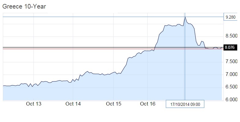 Η απόδοση του ελληνικού 10ετούς ομολόγου το βράδυ της Δευτέρας ήταν στο 6,7%, δηλαδή στα μέσα επίπεδα της εβδομάδας που προηγήθηκε. Το πρωί της Τρίτης 14 Οκτωβρίου και αφού είχαν μεσολαβήσεις οι δηλώσεις του κ. Ντάισελμπλουμ, έσπασε το φράγμα του 7% και ανήλθε έως το 7,6%. Την Τετάρτη ξεπέρασε το 8% και την Πέμπτη 16 Οκτωβρίου σκαρφάλωσε ενδοσυνεδριακά έως και το 9,28%.