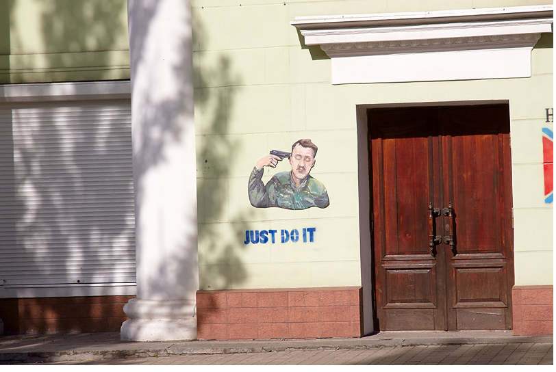 Η αρχή έγινε τον περασμένο Αύγουστο, όταν έξω από ένα κτίριο του Ντονέτσκ εμφανίστηκε ένα γκραφίτι του Ζαχάροφ, που απεικόνιζε τον στρατιωτικό ηγέτη των αυτονομιστών, Ιγκορ Στρέλκοφ, να κρατάει ένα περίστροφο στο κεφάλι του κι από κάτω να φιγουράρει το πασίγνωστο διαφημιστικό σλόγκαν «Just Do It», δηλαδή «Καν’ το!».