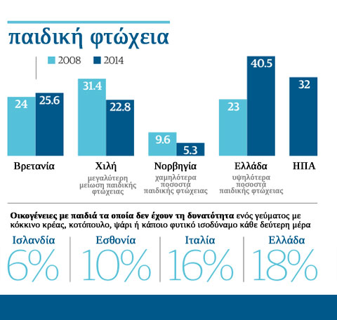 Τη μεγαλύτερη αύξηση καταγράφουν μέχρι στιγμής η Ελλάδα, με ποσοστό 40,5% (από 23% το 2008) και η Ισλανδία και έπονται η Λετονία (μαζί με την Ισπανία, με ποσοστά πάνω από 36%), η Κροατία και η Ιρλανδία. Στις Ηνωμένες Πολιτείες, το ποσοστό παιδικής φτώχειας αγγίζει το 32%. Στον αντίποδα, όπου δηλαδή τα ποσοστά αυτά μειώθηκαν, βρίσκονται χώρες όπως η Χιλή (μείωση από 31,4% σε 22,8%).