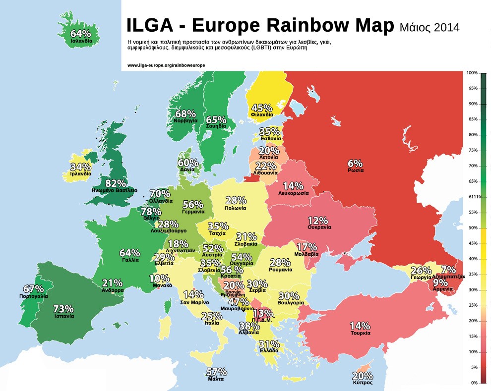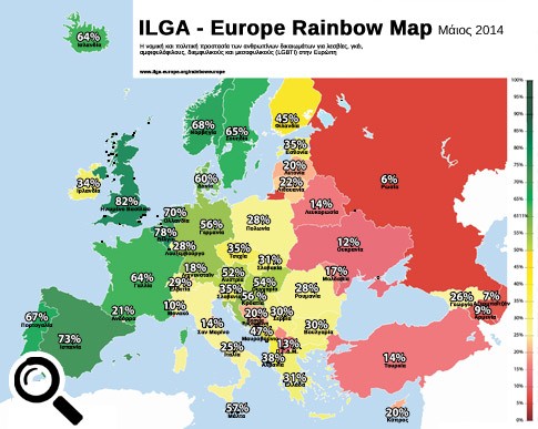 Στον ευρωπαϊκό χάρτη της ILGA για τη νομική και πολιτική προστασία των ανθρωπίνων των LGBTI ατόμων που έγινε τον περασμένο Μάιο, ανάμεσα σε 49 χώρες η Ελλάδα βρίσκεται στην 23η θέση. Η καλύτερη χώρα όσον αφορά την προστασία των δικαιωμάτων των LGBTI ατόμων είναι η Βρετανία (βρίσκεται στην πρώτη θέση) και η χειρότερη, στην 49η θέση βρίσκεται η Ρωσία.