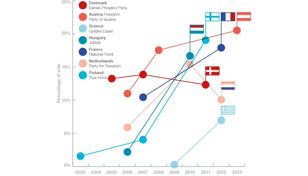 Για τον πολιτικό εθνικισμό στην Ευρώπη -στον οποίο περιλαμβάνει και την ελληνική Χρυσή Αυγή- η έκθεση αναφέρει πως αυτός έρχεται να λειτουργήσει ως «καταφύγιο» εκείνων που βάλλονται από την «άνιση και άδικη» ανάπτυξη και αναζητούν την επιστροφή στις «παλιές αξίες» και τις παραδοσιακές ταυτότητες για να προστατευθούν από την οικονομική αναστάτωση και την κοινωνική αποδιάρθρωση της παγκοσμιοποίησης.
