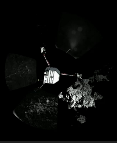 Πανοραμικό φωτομωσαϊκό από την επιφάνεια του κομήτη. Το μαύρο στο πάνω μέρος είναι το κενό του Διαστήματος. Η εικόνα του ρομπότ έχει τοποθετηθεί στο κέντρο από τους ερευνητές (ESA/CIVA)