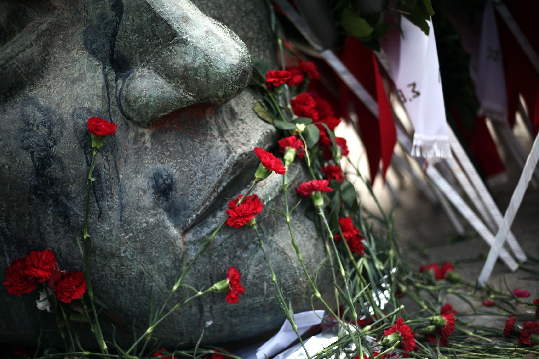 Η πόρτα του Πολυτεχνείου είναι καλυμμένη με κόκκινα γαρίφαλα. Πάνω της υπάρχουν ζωγραφιές μικρών παιδιών με μηνύματα για τα γεγονότα του Πολυτεχνείου.