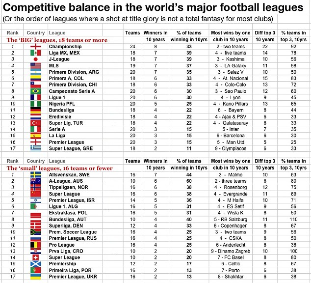 Από τις 18 ομάδες που συμμετάσχουν στη Σούπερ Λιγκ, μόλις δύο έχουν φτάσει την κατάκτηση του τίτλου την τελευταία δεκαετία (9 ο Ολυμπιακός και μια ο Παναθηναϊκός), ενώ μόλις έξι ομάδες έχουν τερματίσει στην πρώτη τριάδα της βαθμολογίας σε αντίθεση με την Premier League όπου στην πρώτη τριάδα έχουν βρεθεί 22 διαφορετικές ομάδες!