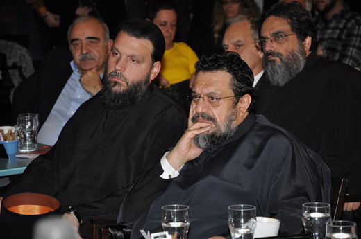 Οι μητροπολίτες κ.κ. Μεσσηνίας Χρυσόστομος (δεξιά) και Νέας Ιωνίας και Φιλαδελφείας Γαβριήλ κατά τη διάρκεια της περουσίασης του βιβλίου Στα Μονοπάτια του Ισλάμ, του Λέκτορα του Τμήματος Θεολογίας (ΕΚΠΑ) Μιχάλη Μαριόρα.