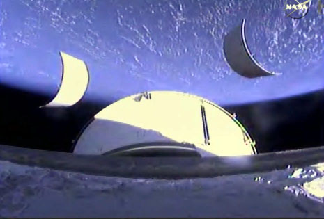 Λήψη από κάμερα στο εξωτερικό του Orion. To σκάφος απορρίπτει το προστατευτικό του κέλυφος ψηλά πάνω από την ατμόσφαιρα.