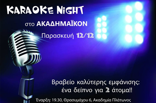Το Ακαδημαϊκόν στην Ακαδημία Πλάτωνος, μας προ(σ)καλεί να πάρουμε τα μικρόφωνα και να αναδείξουμε το… ταλέντο μας χωρίς φόβο αλλά με πολύ πάθος, την Παρασκευή 12 Δεκεμβρίου. Ο τολμηρός που θα προκαλέσει το πιο δυνατό χειροκρότημα θα κερδίσει και ένα δείπνο για δυο άτομα.