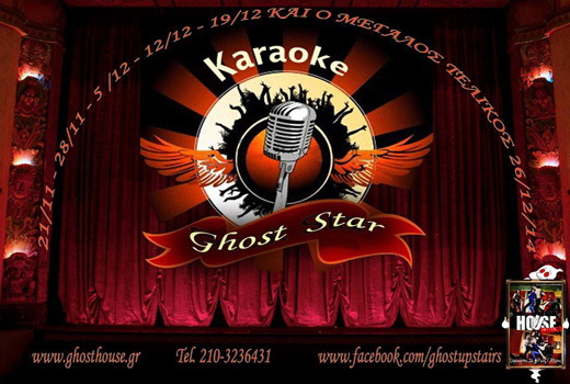 Το Ghost House σας καλεί να ανεβείτε στο… περιβόητο πατάρι με την μπαρόκ διακόσμηση και να αναδείξετε το ταλέντο σας. Βαριές, κατακόκκινες θεατρικές κουρτίνες, έπιπλα που θυμίζουν αντίκες, εσωτερικά μπαλκονάκια με ολόμαυρα κάγκελα, vintage στρογγυλοί καθρέφτες, εντυπωσιακοί πολυέλαιοι, τοίχοι βαμμένοι στις αποχρώσεις του κόκκινου κρασιού και χρυσαφί λεπτομέρειες συνθέτουν το πιο πρωτότυπο σκηνικό για να φιλοξενήσει τα πρώτα σας βήματα… επί σκηνής! Για δέκατη συνεχή χρονιά το γνωστό στέκι του Ψυρρή, σας περιμένει κάθε Παρασκευή για να βγάλετε τα απωθημένα σας στο μικρόφωνο, επιλέγοντας το κομμάτι που σας ταιριάζει μέσα από χιλιάδες ελληνικά και ξένα τραγούδια. Στις βραδιές karaoke του Ghost House πραγματοποιούνται διαγωνισμοί καλύτερης φωνής, καλύτερης σκηνικής παρουσίας, αλλά και χειρότερης φωνής.