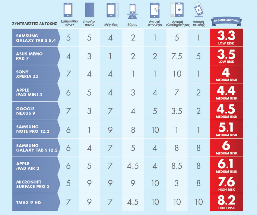 Οι «συντελεστές αντοχής» που εξετάζει η εταιρεία αφορούν το μπροστινό και το πίσω πάνελ, το μέγεθος της συσκευής, το βάρος, την αντοχή του στο νερό, την δοκιμή ολισθηρότητας και την δοκιμή πτώσης. Ενδιαφέρον είναι ότι το Asus Memo Pad 7 βρίσκεται δεύτερο στην λίστα, ενώ κοστίζει περίπου 130 ευρώ στην ελληνική αγορά.