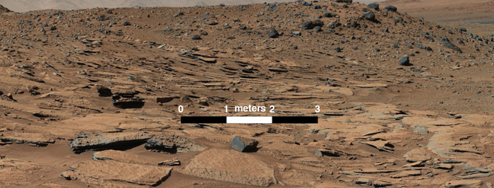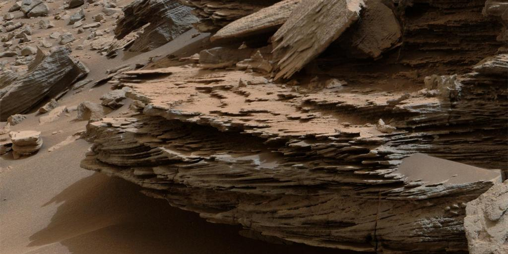 Κλικ για μεγέθυνση: Αλλεπάλληλα στρώματα διακρίνονται σε αυτόν τον ιζηματογενή βράχο, ο οποίος δεν μπορεί παρά να δημιουργήθηκε μέσα σε νερό (NASA/JPL-Caltech/MSSS)